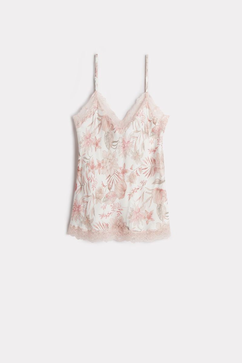 Blusa em cetim de viscose com decote em V, decorado com encaixes em renda no decote e bainha. As alças são finas e reguláveis. Ideal para usar como roupa íntima ou sob o casaco.