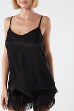 Top em cetim de viscose jacquard com padrão animalier, realçado com debruado com franjas na orla inferior. Alças finas reguláveis.